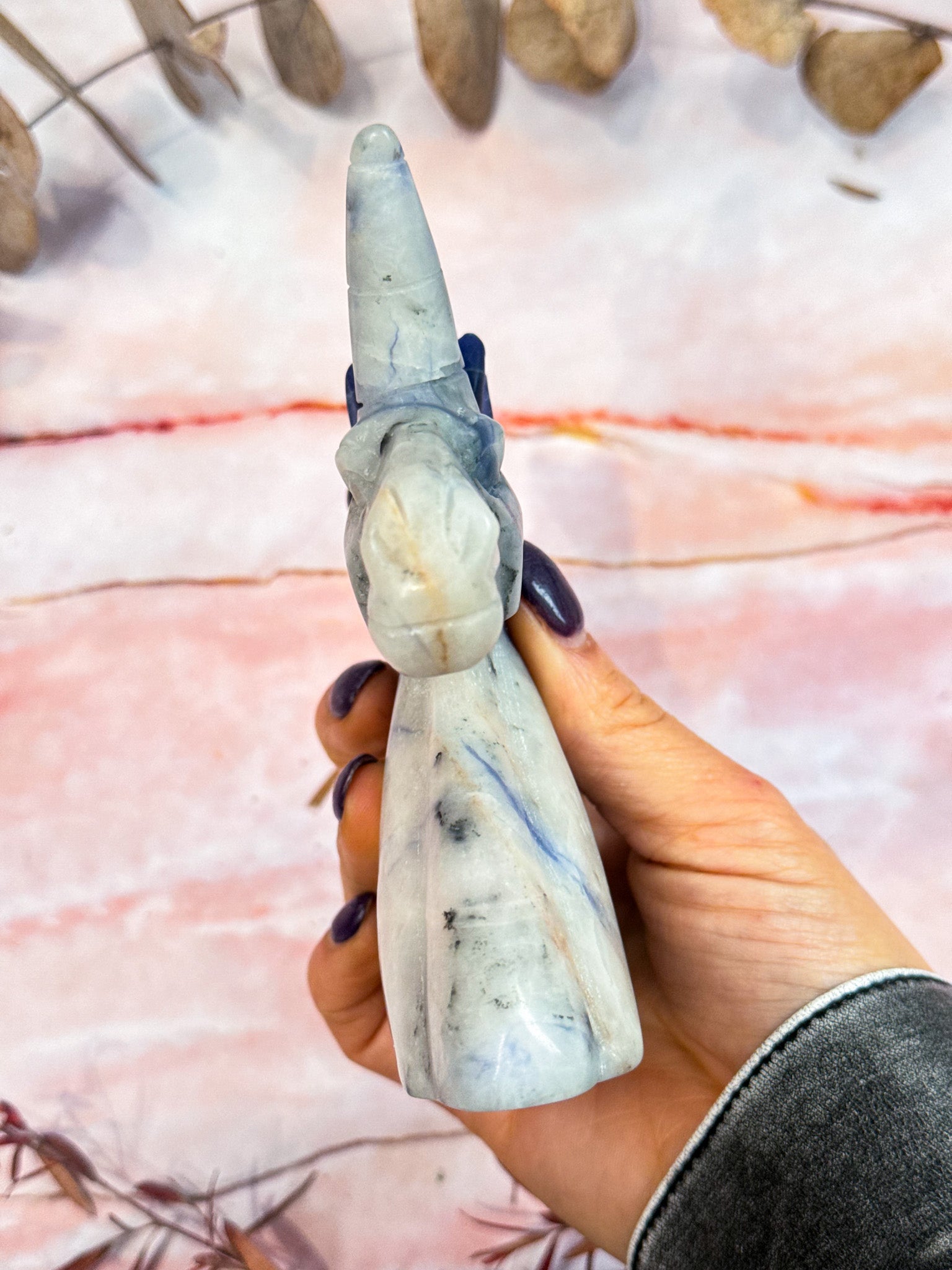 Behold your majestic mineral companion! This enchanting deep blue afghanite unicorn—also called porcelain agate—brings a touch of magic to any space. With its stunning natural striations and rich cobalt hues, each piece is wonderfully unique. The self-standing design means no display stand needed—just place it proudly on a shelf, desk, or altar. Perfect for crystal collectors, fantasy lovers, or anyone seeking a whimsical conversation starter that doubles as natural art.