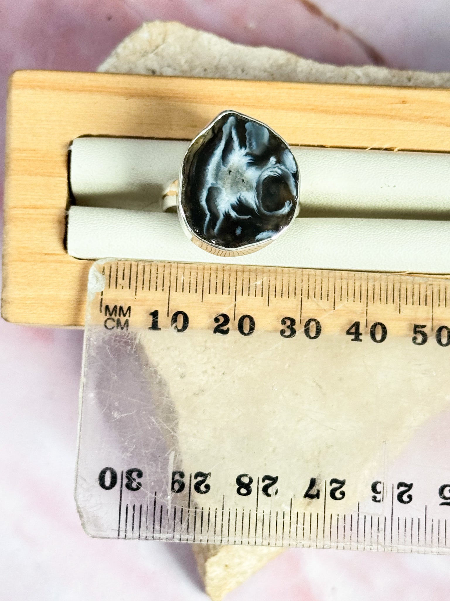 Slip on a slice of geological magic with this stunning sterling silver ring featuring a raw agate occos geode studded with sparkling quartz druzy. Each piece is nature's own masterpiece—no two are exactly alike. Perfect for crystal lovers, geology enthusiasts, or anyone who wants to carry a little earthly wonder on their fingertips. This playful statement piece brings texture, shimmer, and serious conversation-starter vibes to any hand.