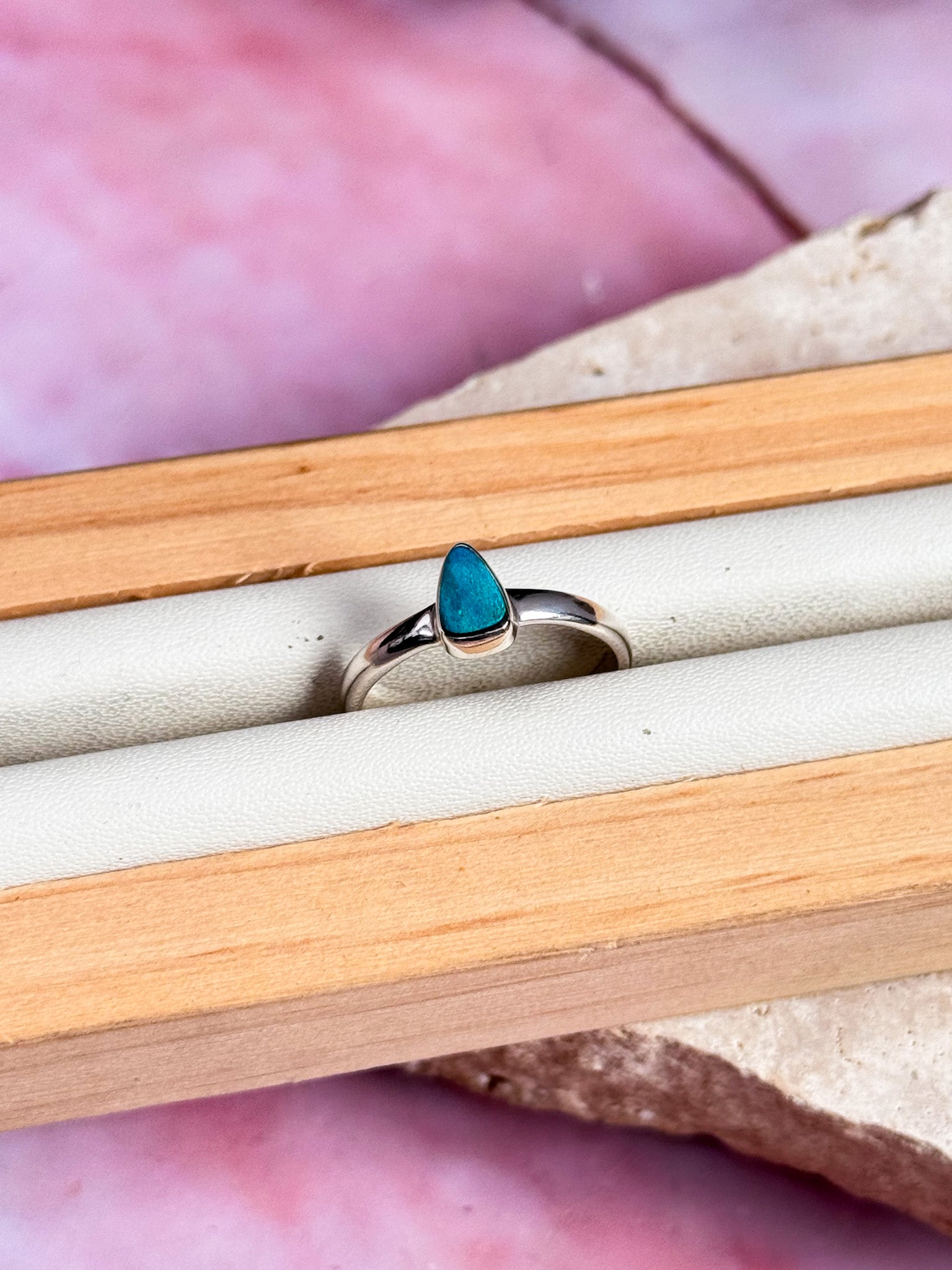 Catch the magic of the Australian outback on your finger with this dainty opal ring that's pure eye candy. Featuring a genuine Australian opal with mesmerizing blue flash that dances in the light, paired with gleaming sterling silver that keeps things elegant and timeless. Perfect for stacking, layering, or letting it shine solo—this little beauty is ready to become your new favorite piece. Delicate enough for everyday wear, stunning enough to turn heads.