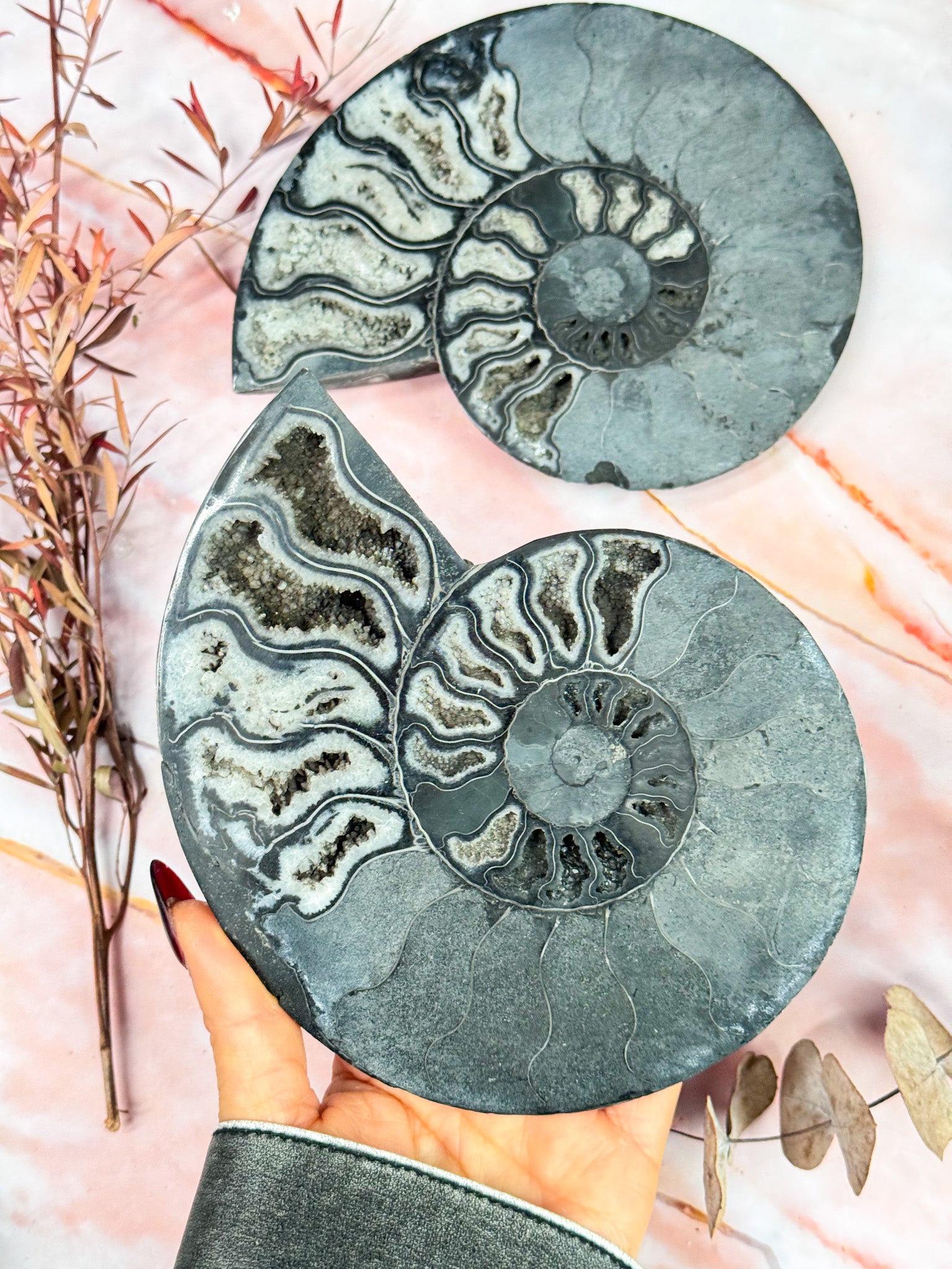 Discover the magic of ancient oceans with this playful Black Ammonite Pair. Each fossil dazzles with natural druzies sparkling inside, complemented by unique calcification patterns that tell a story millions of years old. Perfect for collectors or anyone enchanted by nature’s timeless art—these ammonites bring a touch of prehistoric charm to your space with a fun twist.