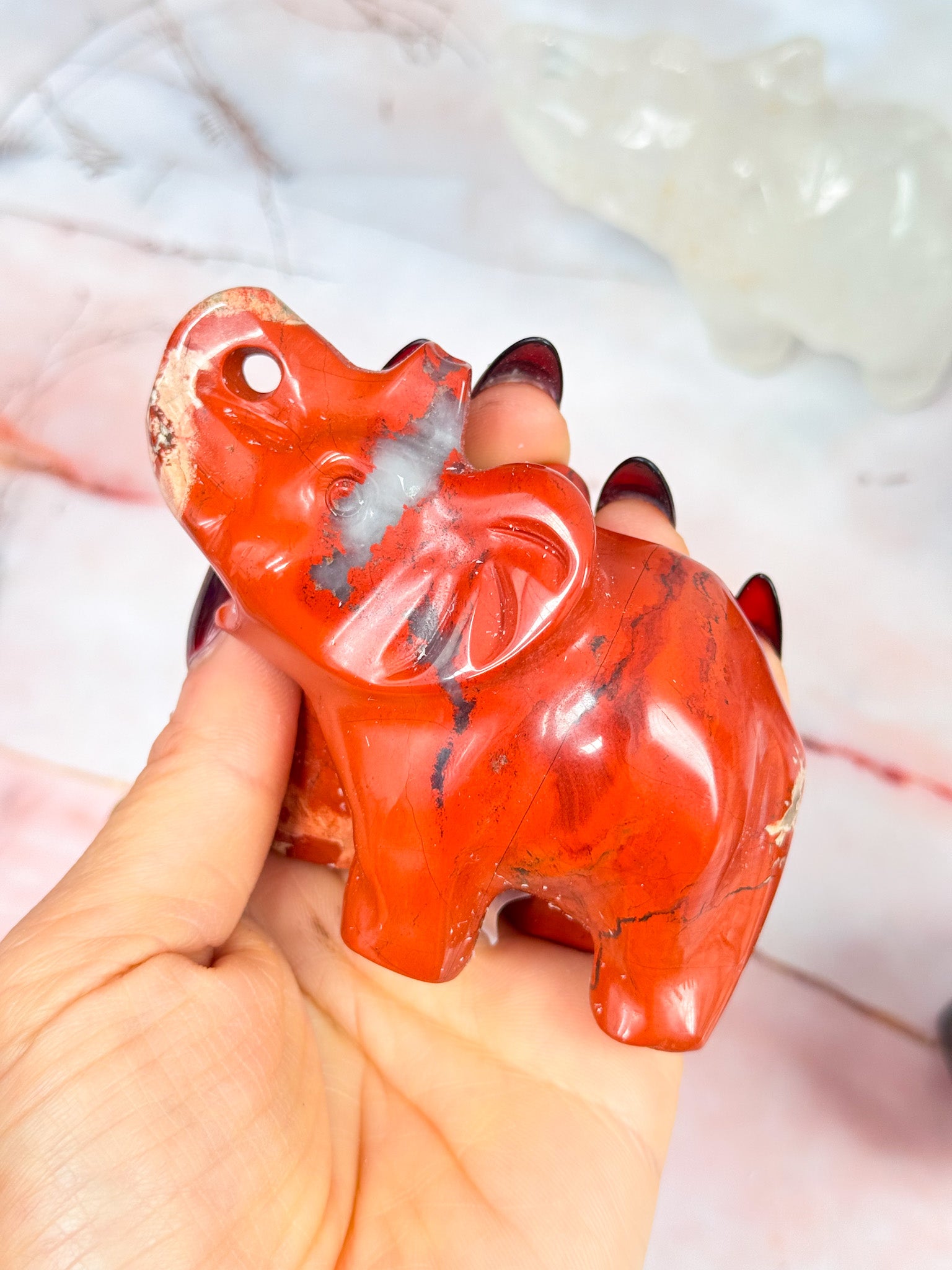 These playful crystal elephant carvings come in vibrant red jasper, clear quartz, UV-reactive yooperlite, and sleek black obsidian. Each self-standing piece features an upturned trunk, a charming symbol of good luck ready to brighten your space with positive vibes and unique style.
