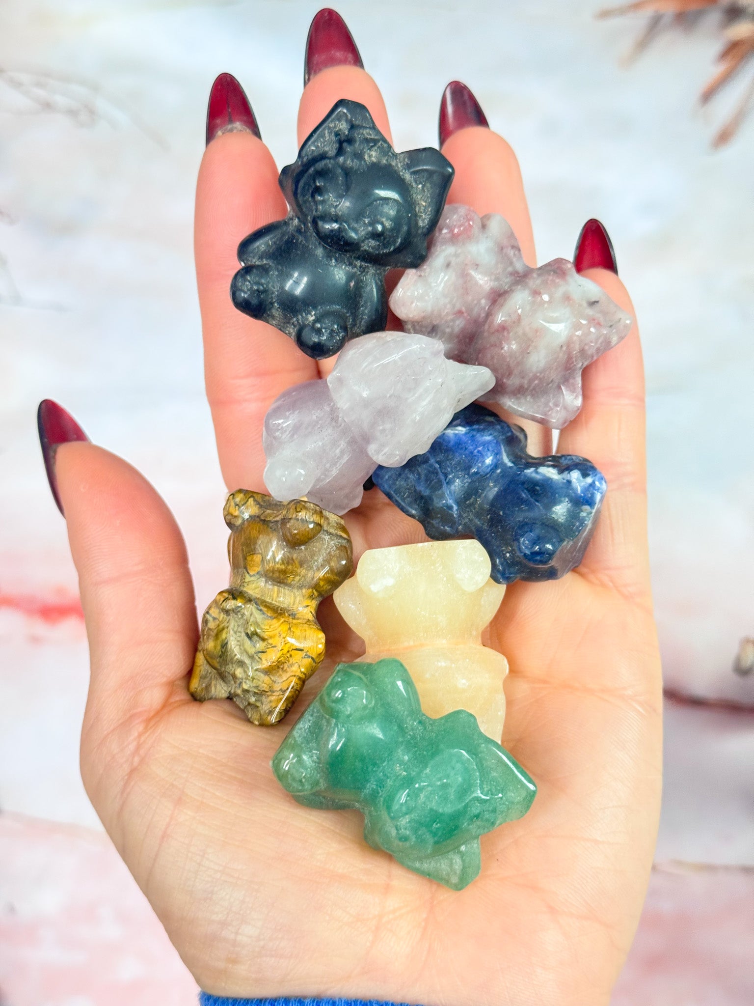 These charming crystal carvings blend the curious spirit of raccoons with a touch of feline grace, delighting with every glance. Each piece captures the whimsical essence of these creatures, sparkling with natural beauty. Perfect as a playful accent or a unique gift, these carvings bring a bit of magic and charm to any space.