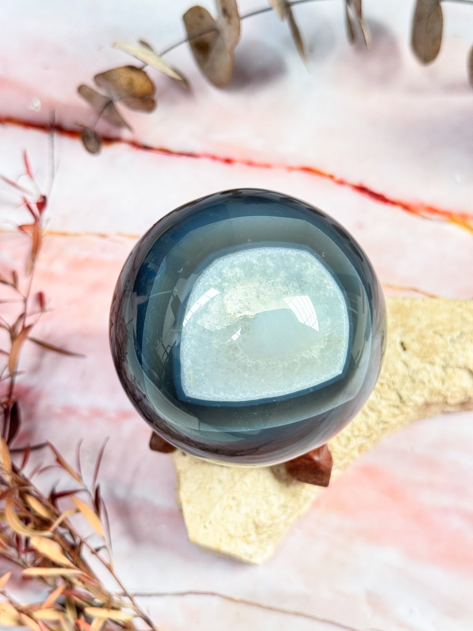 Discover the quirky charm of the 'Eyeball' Agate Sphere—a unique blend of agate and quartz that perfectly mimics the look of a staring eyeball. Its mesmerizing patterns make it a fun conversation starter and a playful addition to any room or crystal collection. Add a touch of whimsy and natural wonder to your space with this one-of-a-kind sphere!