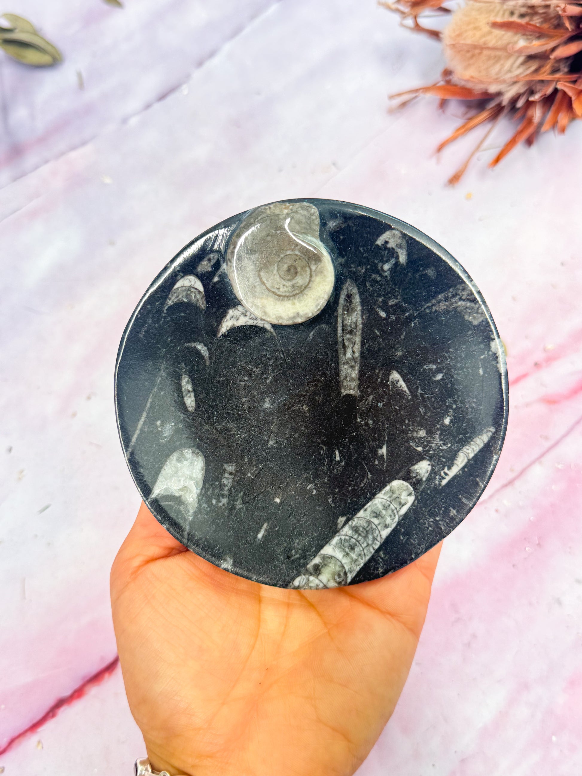 These beautiful fossil bowls feature intricate orthoceras and goniatite designs, making them a stunning addition to any home. Crafted with precision and care, these bowls are sure to impress any lover of fossils and natural history. Add a touch of elegance and fascination to your decor with these one-of-a-kind bowls.