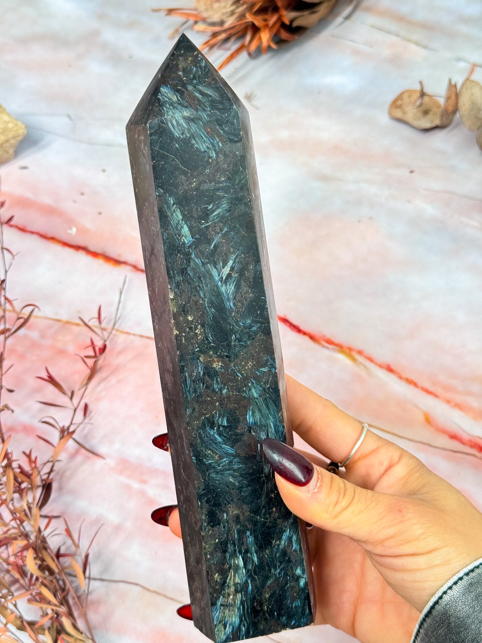 Discover the captivating Garnet in Arfvedsonite Tower, where rich red garnet crystals sparkle against a backdrop of deep blue arfvedsonite with shimmering silver flashes. This striking tower brings a pop of color and mystique to any space, perfect for adding vibrant energy and a touch of magic to your collection. Let its playful flashes delight your eyes and inspire your adventures.