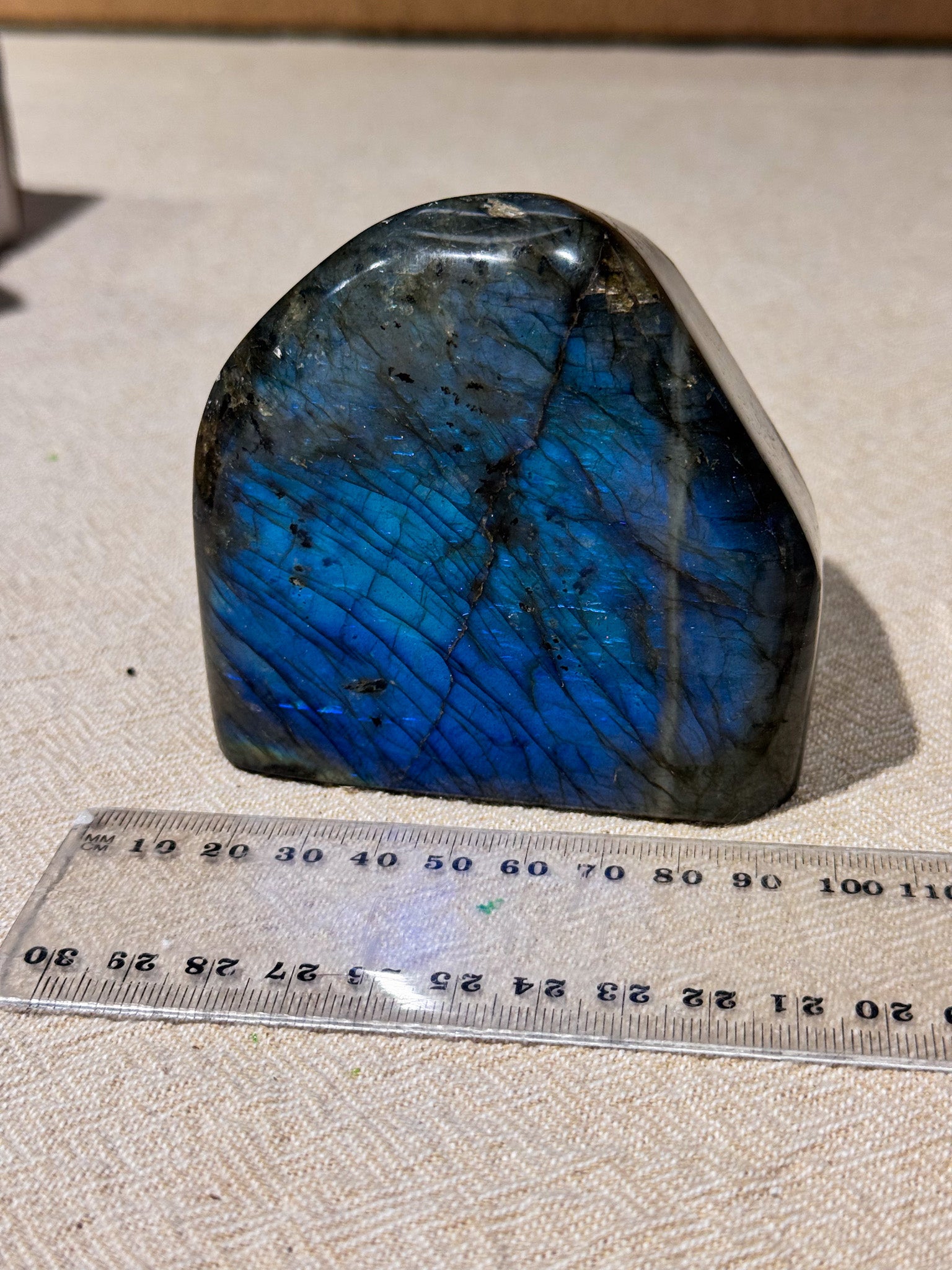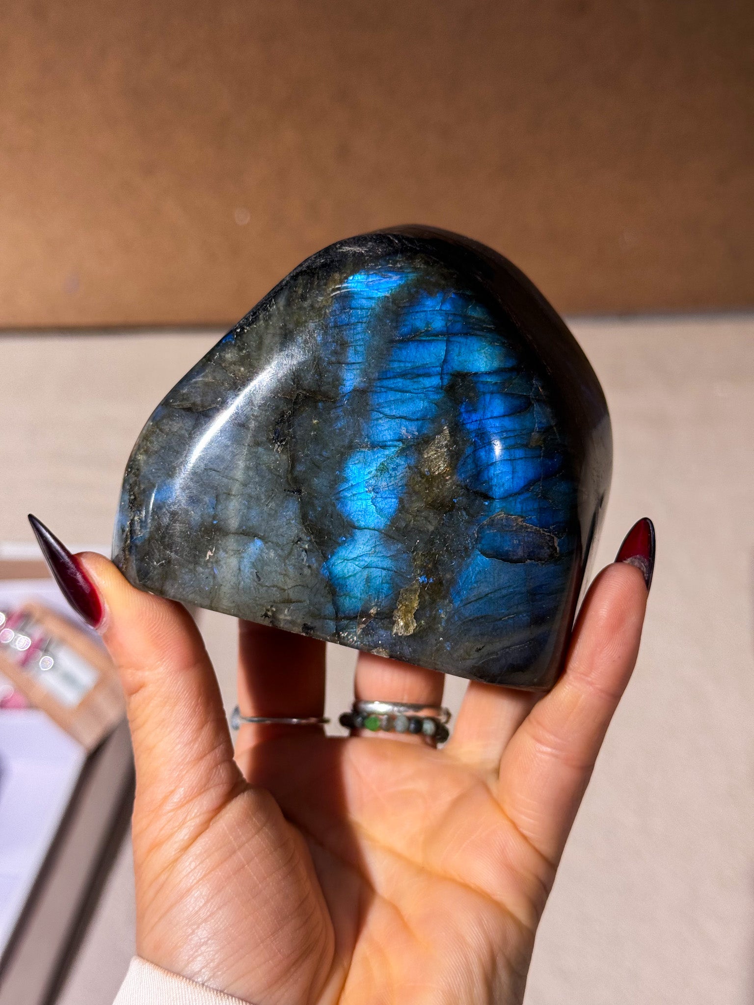Add a splash of magic to your space with this stunning labradorite freeform. Its mysterious blue flash dances beautifully in the light, catching every eye with its unique glow. Standing on its own, it’s the perfect little gem to brighten your day and spark your curiosity.