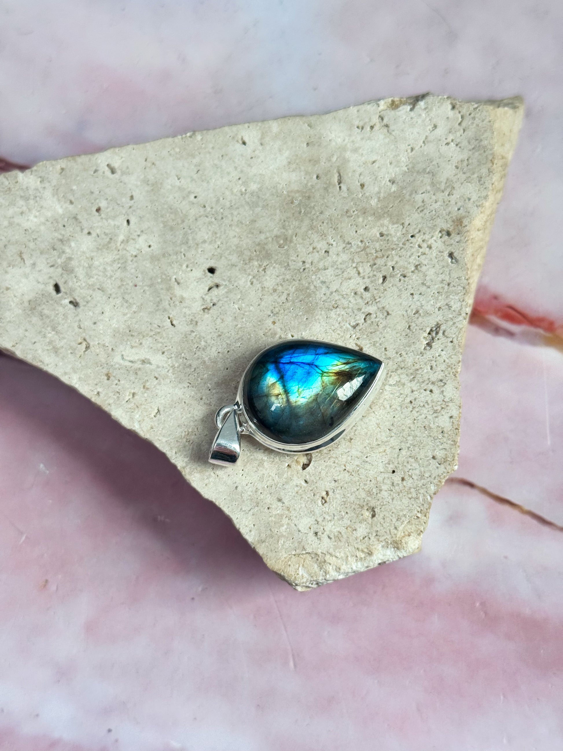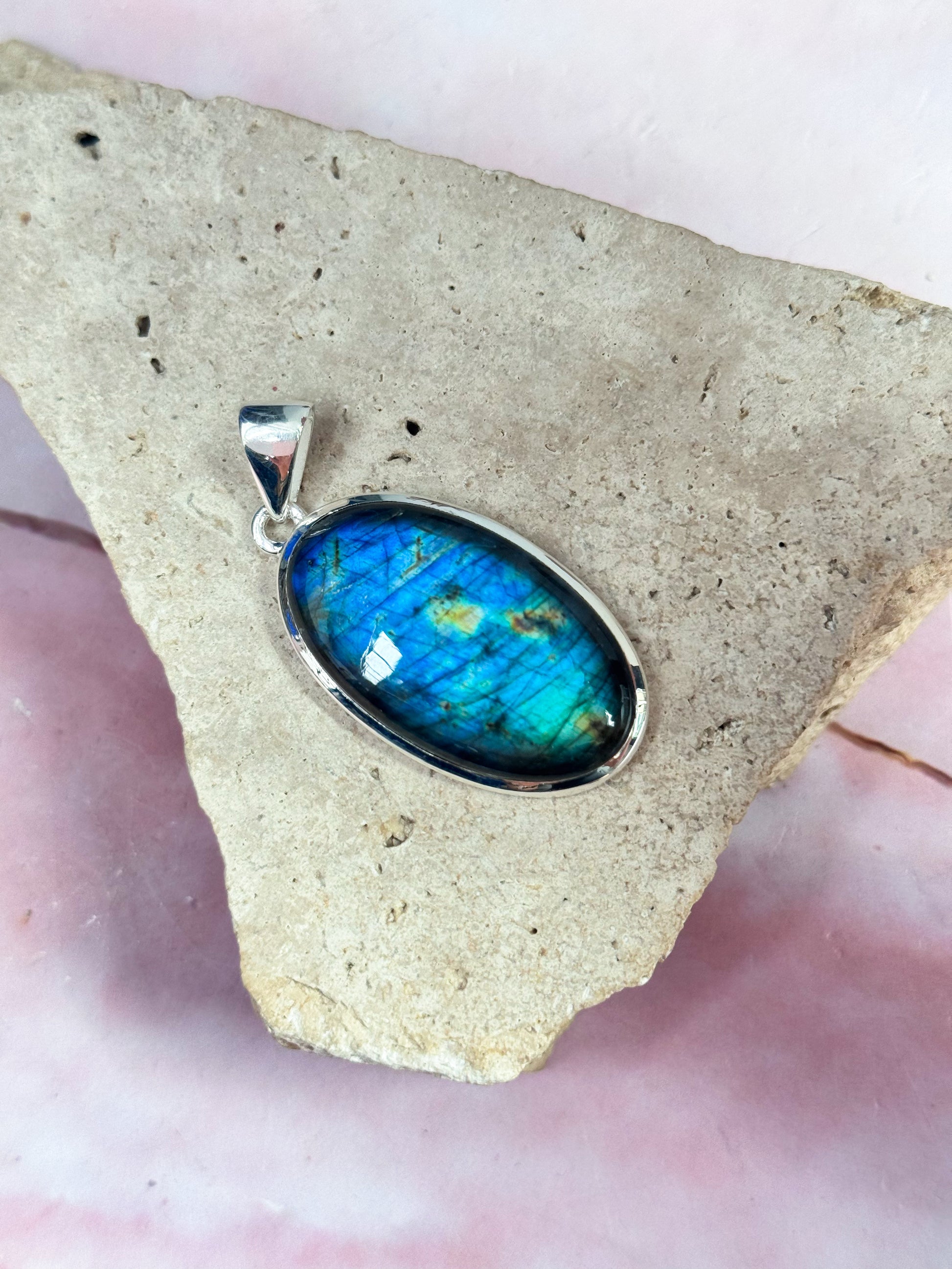 Catch the magic of the cosmos with these stunning labradorite pendants! Watch as mesmerizing blue and gold flashes dance across the stone's surface with every movement—it's like wearing a piece of the night sky. Each pendant showcases the unique play of light that makes labradorite so enchanting, perfect for crystal lovers and anyone who appreciates nature's hidden sparkle. A playful touch of mystique for your everyday style.
