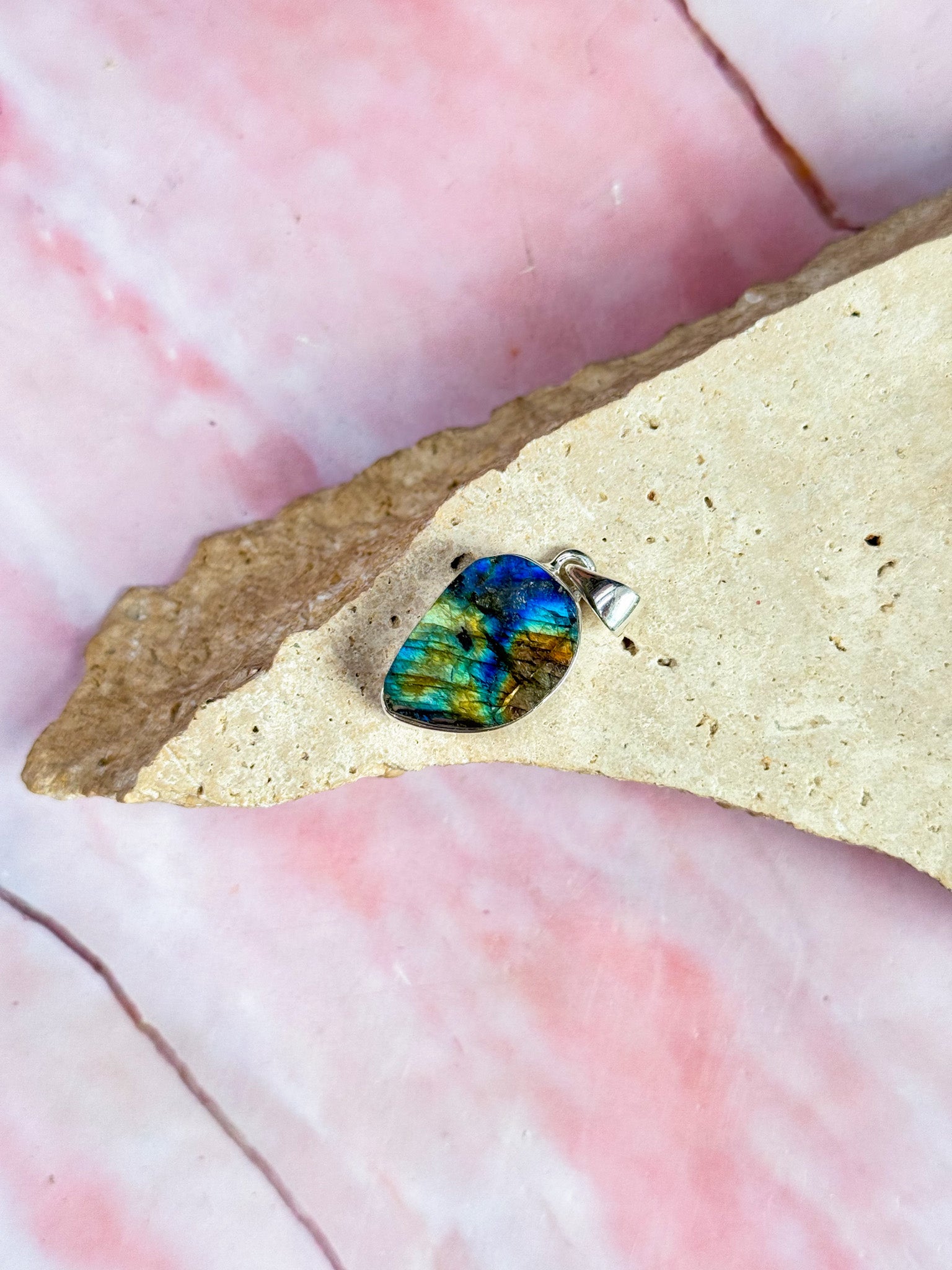 Catch the light and watch the magic happen! These stunning labradorite rough pendants are nature's own light show, bursting with mesmerizing blue, gold, and green flash that dances across each unique stone. Paired with sterling silver, they're the perfect blend of raw natural beauty and polished elegance. Each pendant is one-of-a-kind, making it an ideal choice for crystal lovers and anyone who appreciates a little geological sparkle in their life.