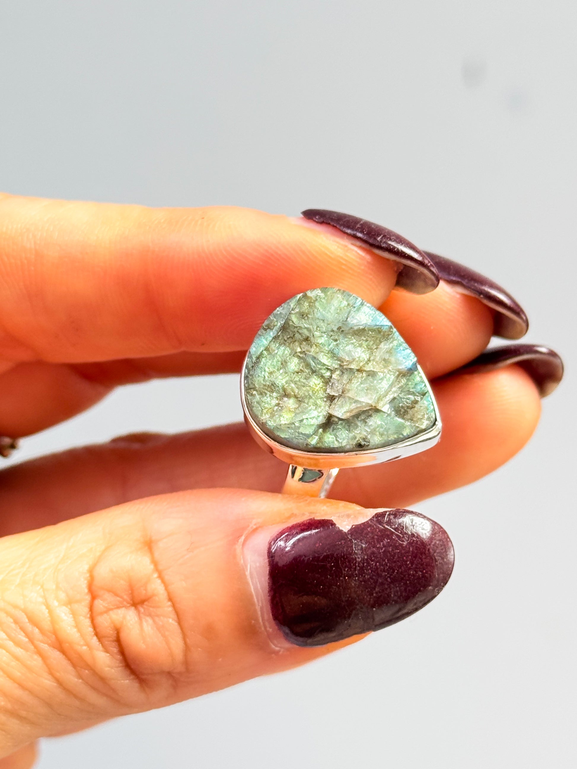Catch the magic in your palm with these stunning labradorite rough rings, where nature's most dazzling light show meets timeless sterling silver. Each piece flashes with that mesmerizing blue-green shimmer labradorite is famous for—the kind of sparkle that makes people stop and ask what you're wearing. Raw and unpolished, these rings celebrate the stone's natural beauty while the quality sterling silver band keeps things elegant and wearable. Perfect for crystal lovers, bohemian souls, or anyone who wants a conversation starter on their finger.