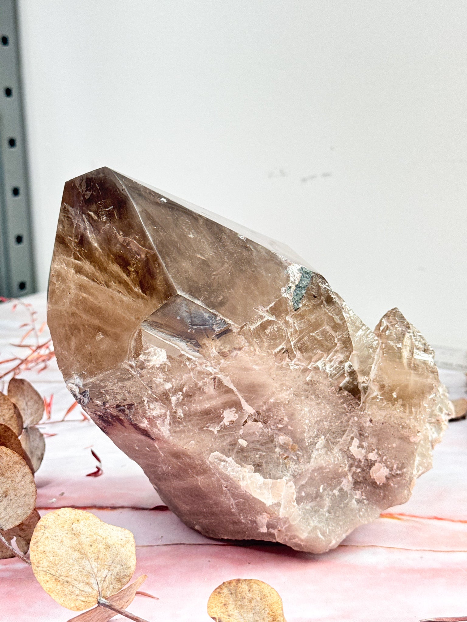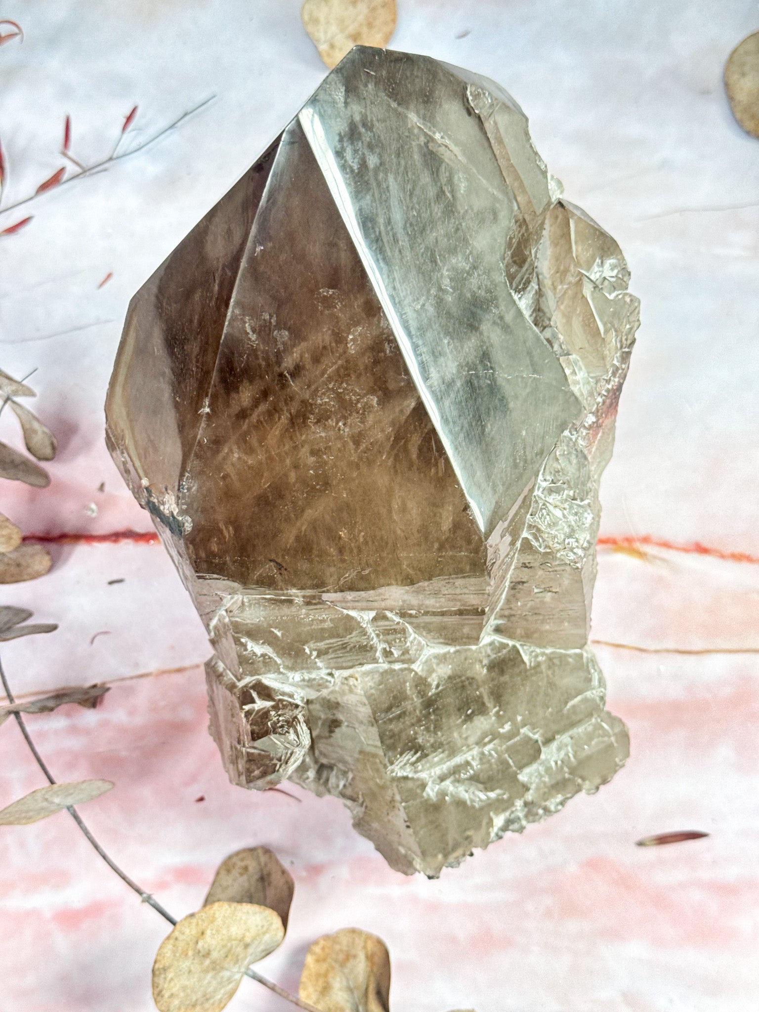 This magnificent smokey quartz cluster is a showstopper that demands a spot on your shelf! Sourced from Malawi, this beauty features a stunning dark grey hue with captivating tourmaline and hematite inclusions that add depth and character. Perfectly self-standing, it's ready to display without any fuss—just unbox and let its natural drama shine. Whether you're a seasoned collector or crystal enthusiast, this geological gem brings serious visual impact and grounding energy to any space.