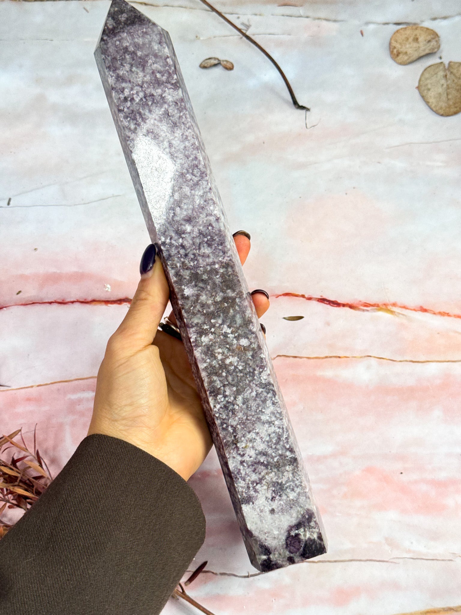 This stunning lepidolite tower is a natural work of art, showcasing gorgeous purple-pink hues interspersed with creamy orthoclase and striking blue kyanite streaks. Each piece is uniquely formed, making it a one-of-a-kind addition to your crystal collection. Perfect for display on a shelf, desk, or altar, this tower brings both visual beauty and grounding energy to any space. A delightful treasure for crystal enthusiasts and collectors alike!