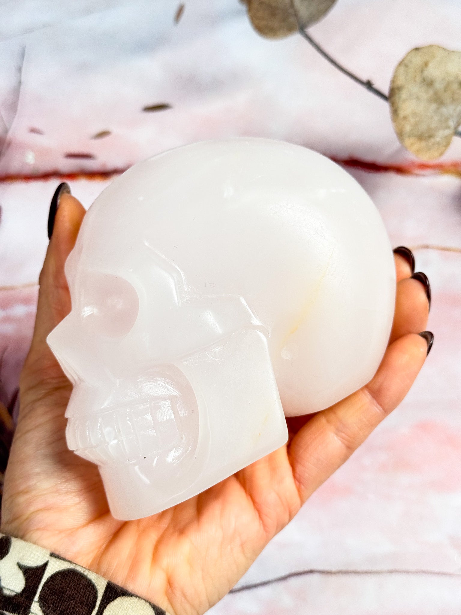 Discover the enchanting beauty of this stunning Mangano Calcite Skull, featuring soft pale pink hues with gorgeous natural banding throughout. This captivating piece glows with an otherworldly luminescence under UV light, revealing hidden patterns that dance across its surface. Perfect for crystal collectors, spiritual seekers, or anyone drawn to nature's artistry, this unique skull combines aesthetic appeal with a touch of mystical magic. Each piece is one-of-a-kind, showcasing the raw elegance of this soothing pink mineral in skull form.