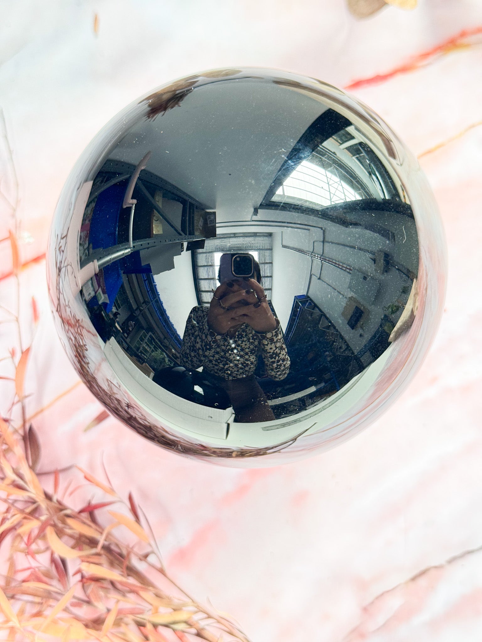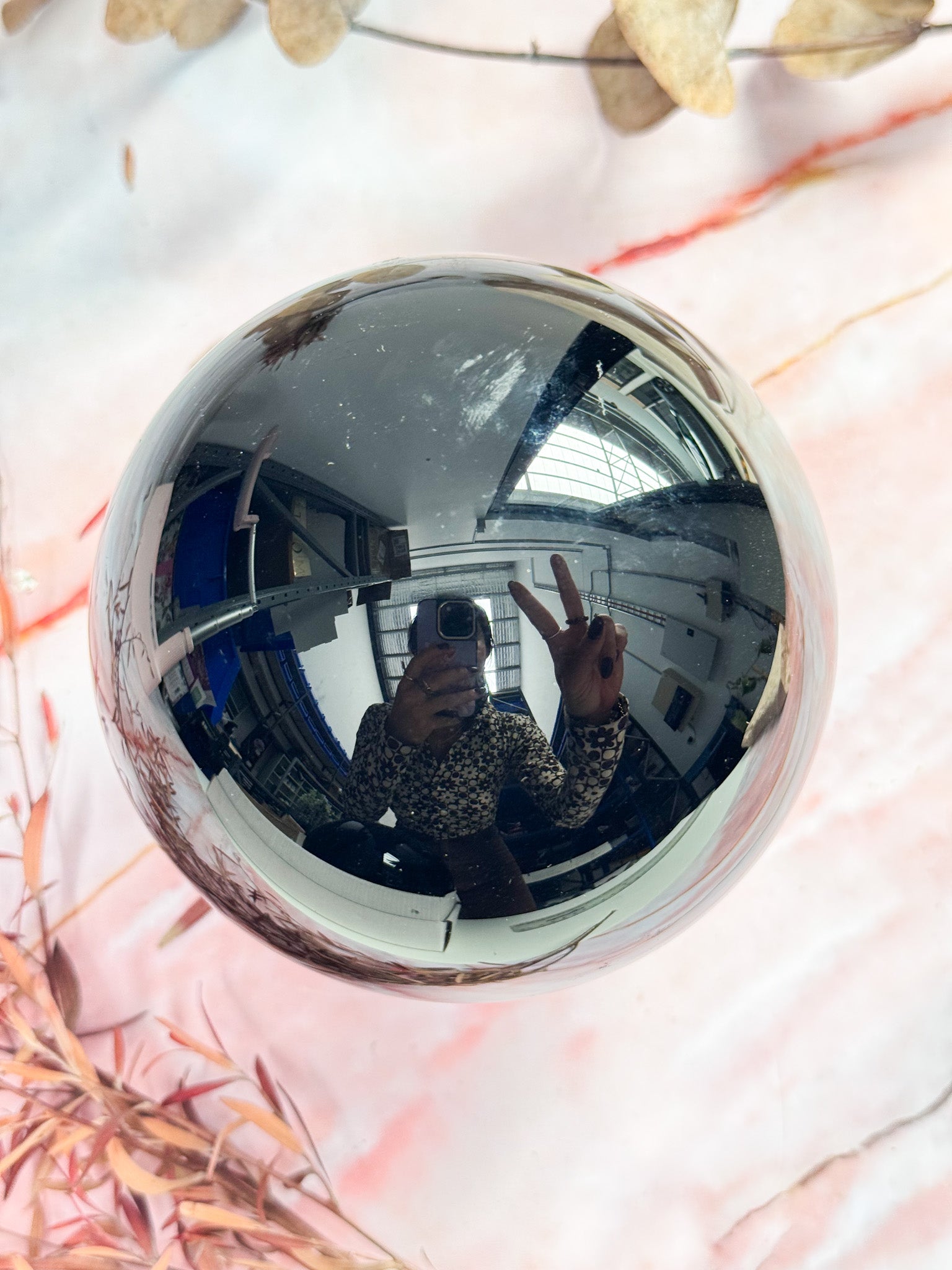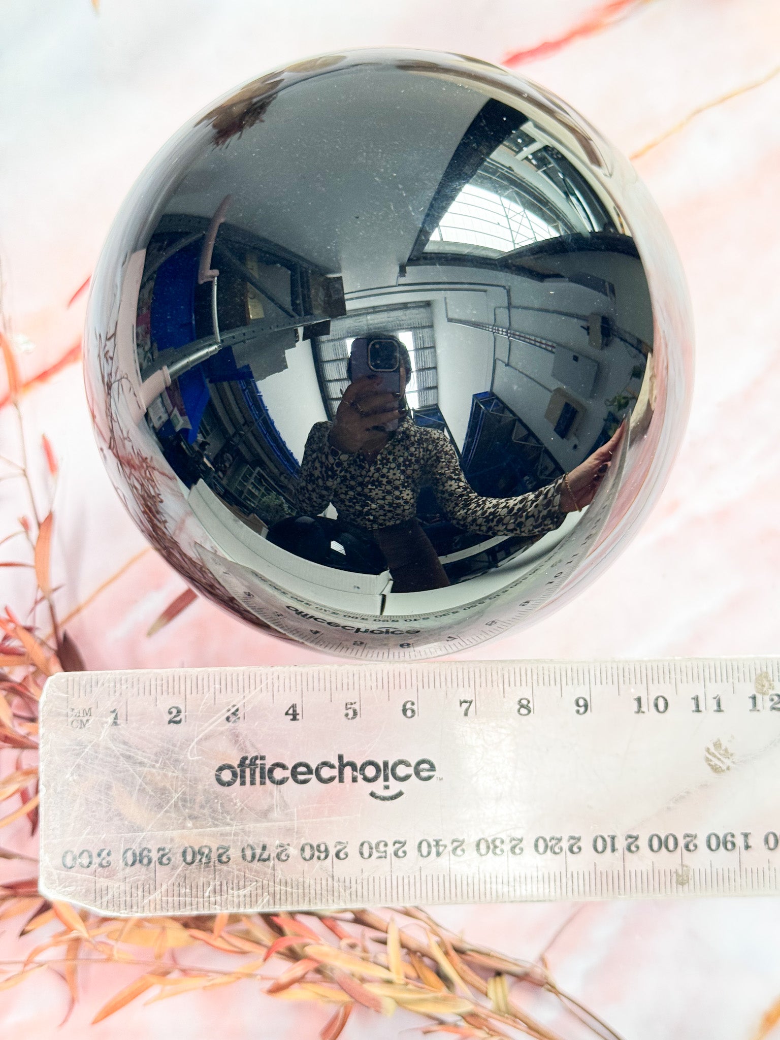 Behold the ultimate conversation starter—a stunning black obsidian sphere with some slight silver sheen that's basically a portal to the earth's mysterious depths, minus the actual danger. This beauty commands attention on any shelf, desk, or meditation space with its glossy, mirror-like finish and weighty presence. Whether you're a crystal enthusiast, a collector of natural wonders, or someone who just appreciates holding something that feels genuinely ancient and powerful, this large sphere delivers serious visual impact. Perfect for grounding your space with a touch of volcanic drama.