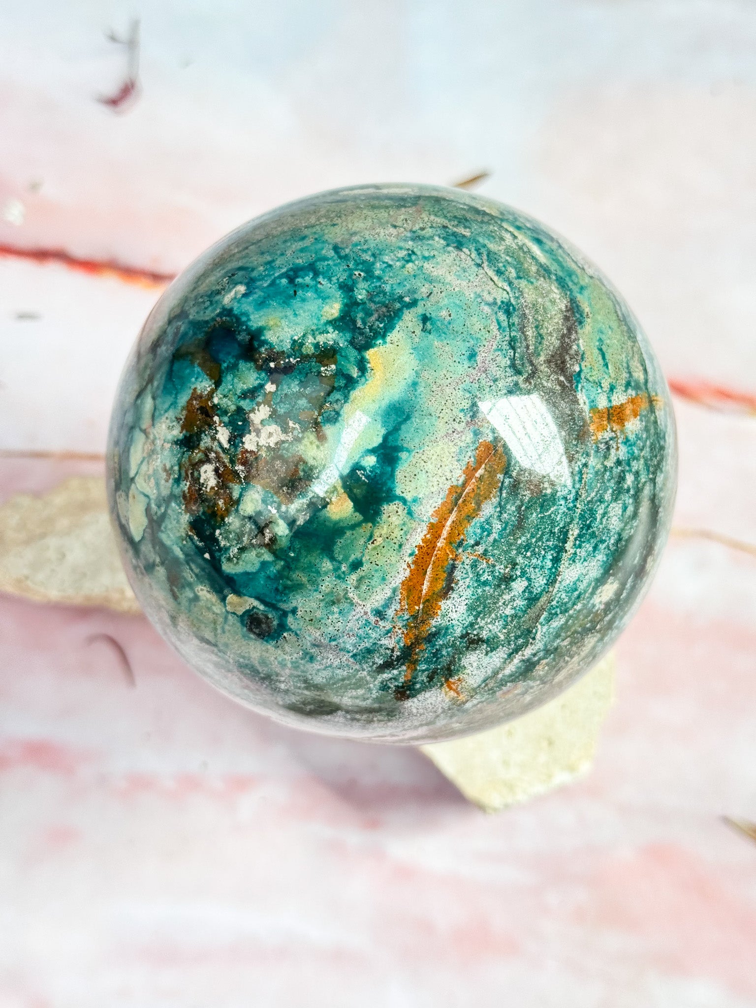 Dive into the mesmerizing world of this Ocean Jasper Sphere, where teal and pink swirls dance together in nature's most whimsical display. Each sphere is a one-of-a-kind treasure, featuring organic patterns that seem to ripple like waves frozen in stone. Perfect for crystal collectors, meditation enthusiasts, or anyone who appreciates the raw beauty of Mother Earth. Hold it in your palm and let its soothing energy transport you to a peaceful seaside escape. A stunning conversation piece that brings coastal vibes and natural wonder to any space.