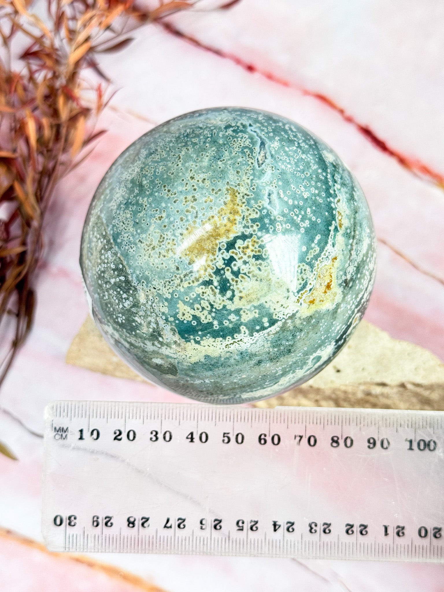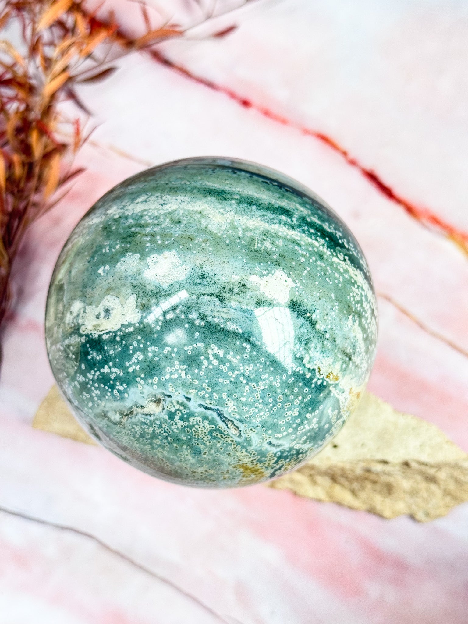 Gaze into this mesmerising Planet Ocean Jasper sphere and discover a whole world swirling within. Bursting with orbicular patterns and dreamy blue swirls that dance across its surface, this beauty captures the essence of vast oceans and distant planets. Each sphere is a one-of-a-kind masterpiece, making it the perfect conversation starter for your shelf, desk, or sacred space. Whether you're a crystal collector or simply drawn to natural wonders, this stunning stone invites you to explore the cosmos from the comfort of your home.