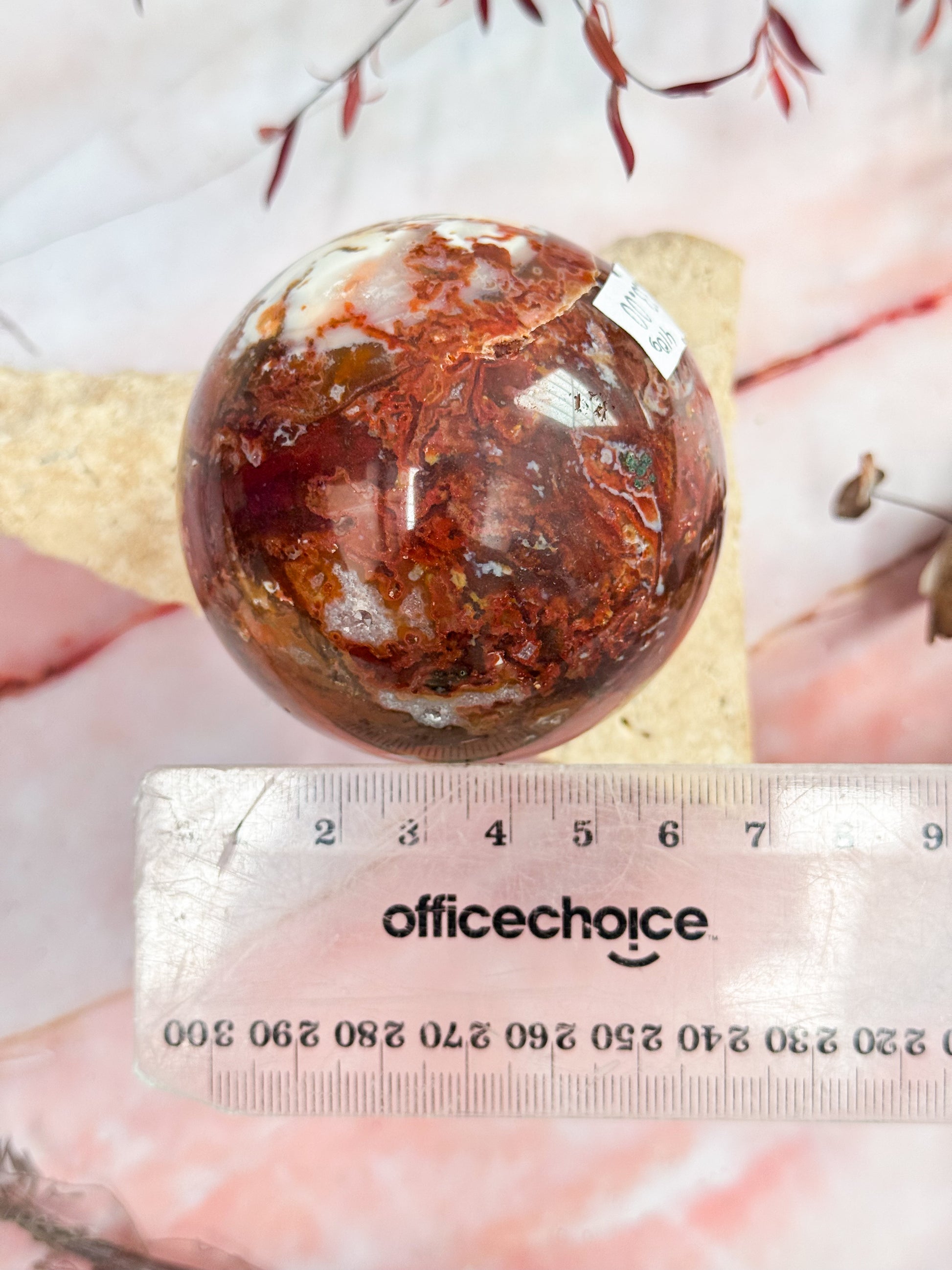 Discover the enchanting Red Moss Agate Sphere, where vivid red and green moss patterns dance naturally within the stone. Paired with sparkling quartz crystallization, this sphere adds a playful touch of nature’s artistry to your space while inviting positive energy and calm vibes. Perfect for collectors and those who love a bit of colorful earth magic!