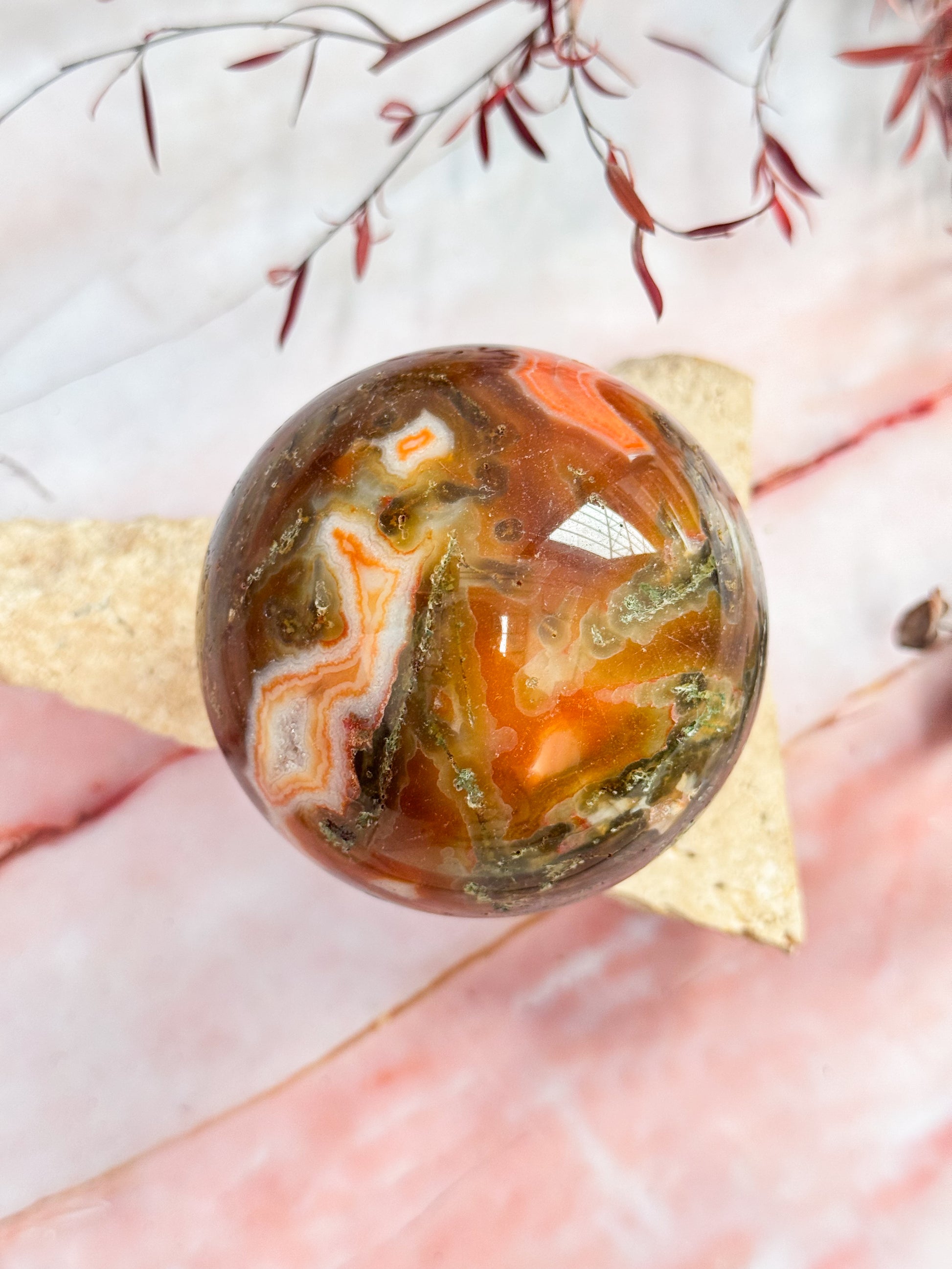 Discover the enchanting Red Moss Agate Sphere, where vivid red and green moss patterns dance naturally within the stone. Paired with sparkling quartz crystallization, this sphere adds a playful touch of nature’s artistry to your space while inviting positive energy and calm vibes. Perfect for collectors and those who love a bit of colorful earth magic!