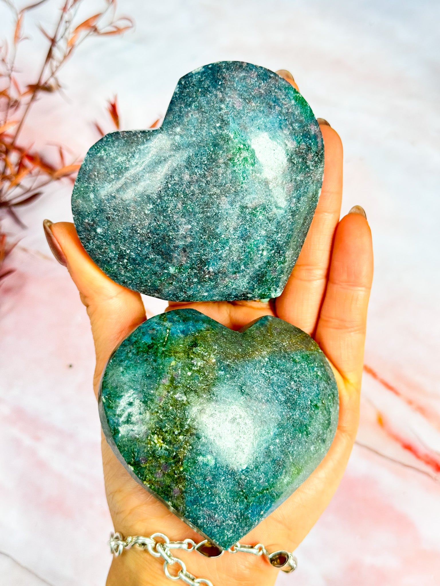 Discover the magic within these stunning Ruby in Kyanite Hearts! Each piece features gorgeous ruby crystals nestled in striking blue kyanite, adorned with shimmering green fuchsite inclusions that catch the light beautifully. Here's the fun part—shine a UV light on these beauties and watch the ruby glow with an otherworldly brilliance! Weighing approximately 260g each, these heart-shaped specimens are substantial enough to make a real statement on any shelf or in any collection. Perfect for crystal enthusiasts, collectors, and anyone who loves a little geological wonder with personality.