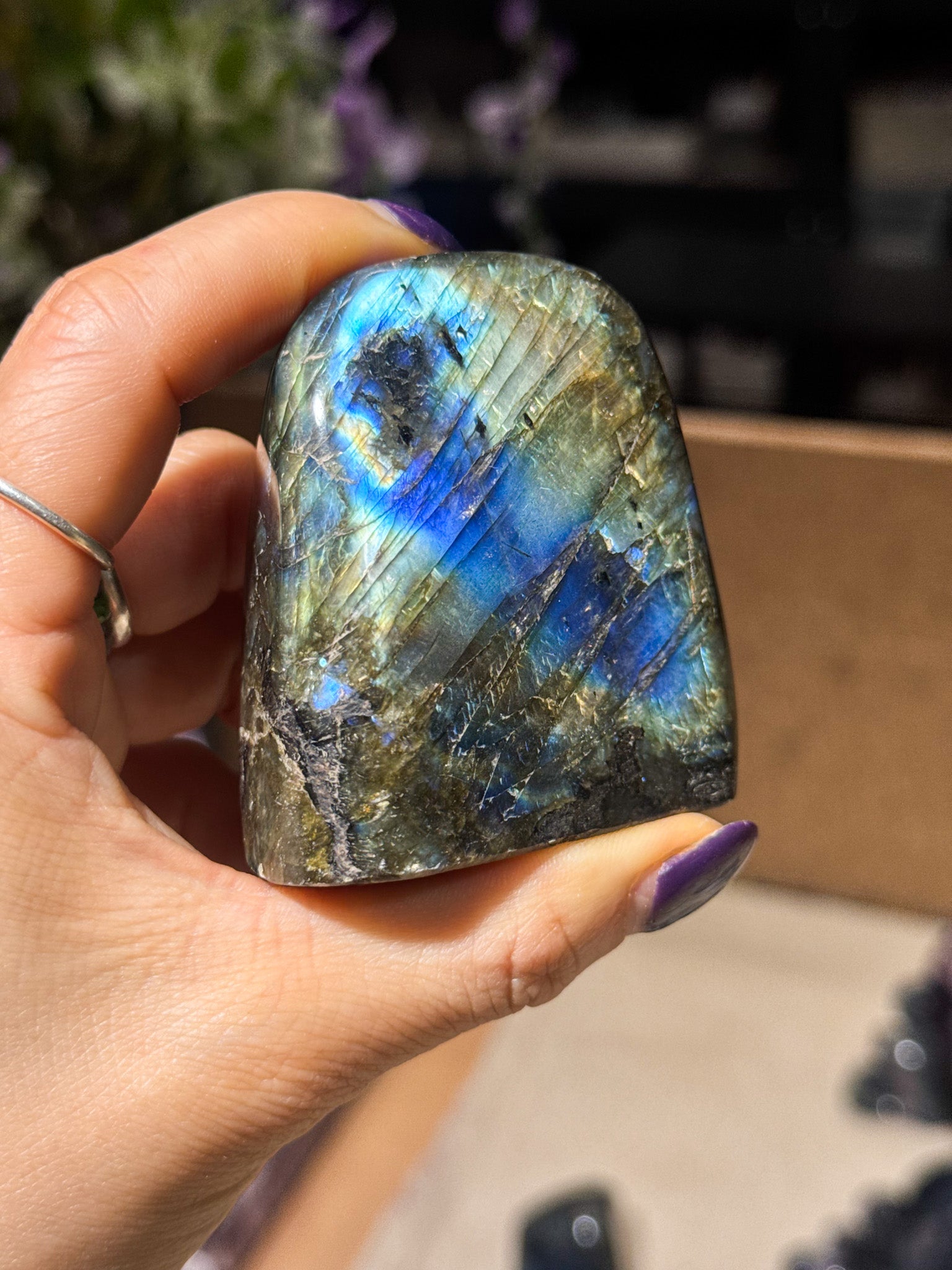 Discover the magic in these petite labradorite freeforms, where rich blues dance with shimmering gold flashes that seem to glow from within. Each self-standing piece is a tiny treasure, perfect for adding a touch of natural wonder to your desk, shelf, or sacred space. These beauties showcase labradorite's signature labradorescence—that mesmerizing play of light that makes every angle a new discovery. Ideal for collectors, crystal enthusiasts, or anyone who loves a splash of geological glamour in their everyday world.