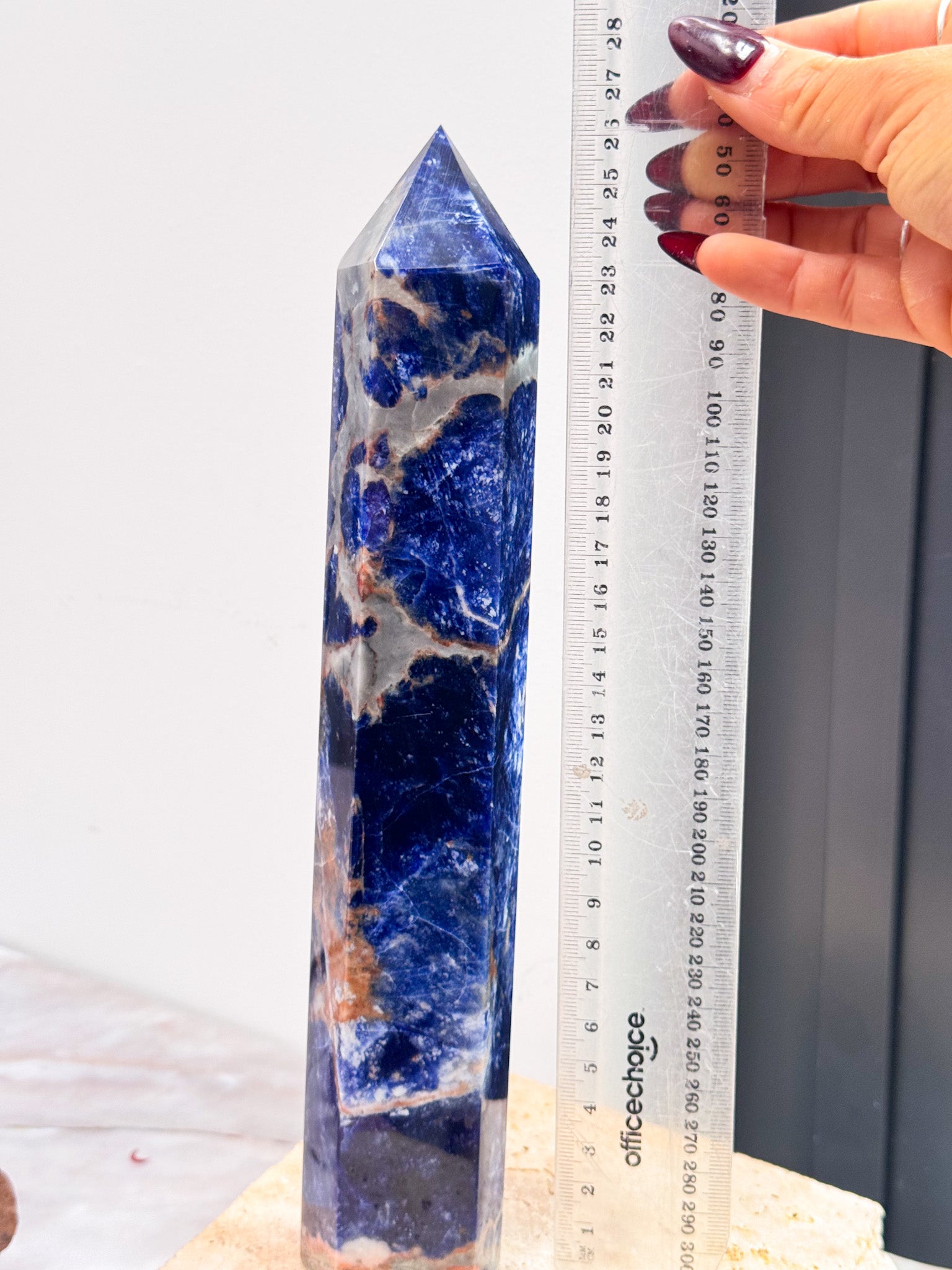 Discover the mesmerizing charm of this large sodalite tower, glowing in deep blue hues with electric lightning patterns naturally etched in its surface. Perfect for adding a splash of magic and energy to any space, it invites you to get lost in its playful dance of colors and light. Let this striking crystal become your bold, beautiful centerpiece!