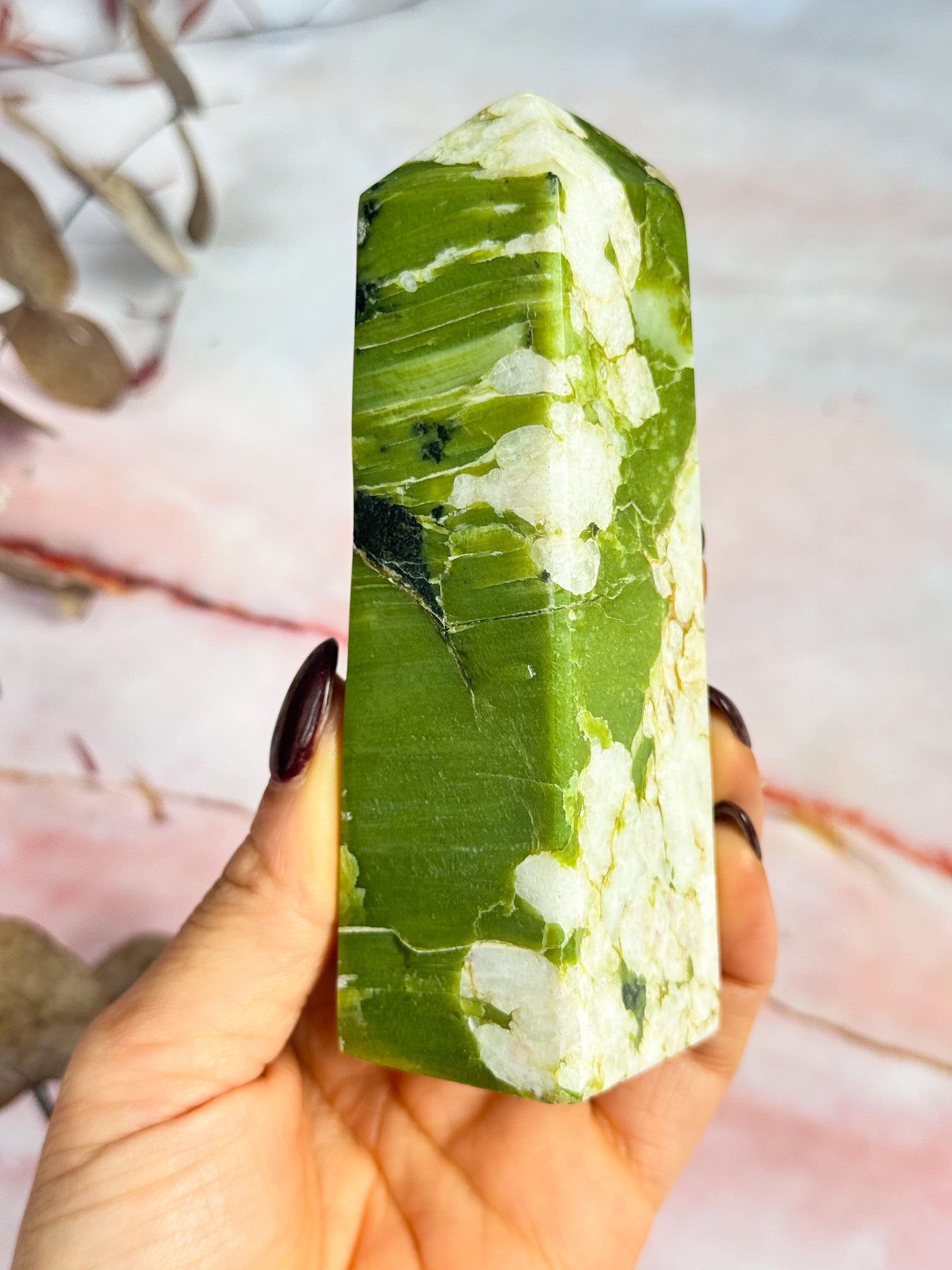 Rise and shine with this captivating deep green tremolite tower from Pakistan! This rare mineral beauty showcases nature's artistry with its striking colour and natural formations. Perfect for crystal collectors, meditation spaces, or anyone drawn to Earth's geological treasures. Each tower is a one-of-a-kind piece that brings grounding energy and visual intrigue to your collection. Let this stunning specimen remind you that some of nature's greatest wonders come in the smallest packages.